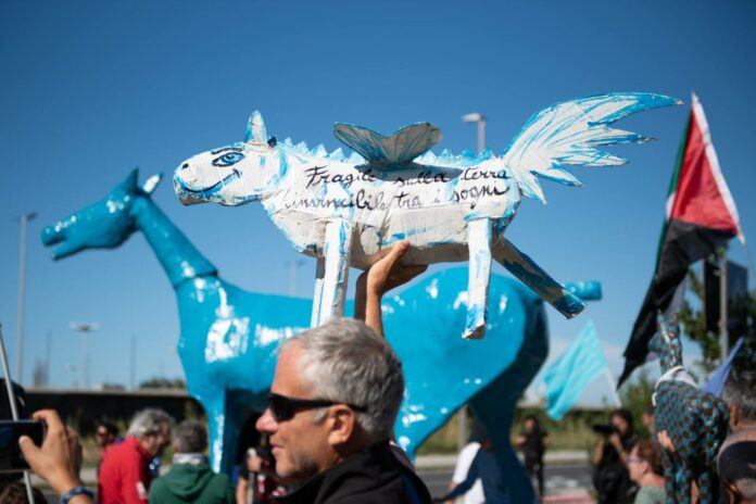 Nella manifestazione di chiusura del viaggio, martedì a Roma, al cinema Aquila, sono stati proiettati due filmati. Un corto sulla manifestazione di Ponte Galeria, dove ancora sono stati pronunciati nomi, storie che la narrazione ufficiale vuole seppellire… e un’anticipazione del film che narrerà l’intero viaggio. Anche questo un lavoro collettivo, ché Giovanni Cioni ha chiamato intorno a sé un bel gruppo di registi. E sarà, ancora una volta, intreccio di sguardi. Che idealmente guardano anche ad altre prigioni, ad altri confini, ad altri viaggi. Se unica bandiera ammessa nei nostri incontri, oltre il patchwork delle bandiere di scarti, è stata quella del popolo della terra di Palestina. In un gemellaggio ideale di Marco cavallo, insieme alla mandria di cavallini, con la Sumud Flotilla, già pensando ai sentieri lungo i quali ci ritroveremo, e presto ci ritroveremo, ancora marciando contro le frontiere, la violenza e le disuguaglianze. Per un mondo più giusto, per tutti.