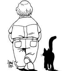 Quando Soriano morì Daniel Paz gli dedicò un disegno che apparve su Il manifesto. Ne avevo conservata la pagina e sicuramente ora si nasconde da qualche parte fra le carte dei miei cassetti. L’ho ritrovato, quel disegno, (miracoli della memoria virtuale!) in rete. Ed eccola qui, la risposta di Soriano… nel silenzio del suo profilo, di spalle, che si allontana, insieme all’amato gatto. E chissà dove staranno randagiando adesso…